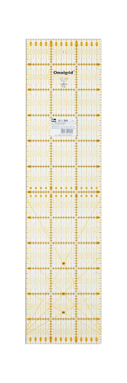 Nom: Règle Omnigrid - 10 x 45 cm Reference: 611 318 Description: Règle Omnigrid pour patchwork. Utilisez pour mesurer, de marquage et de découpe de tissus patchwork avec des couteaux rotatifs.